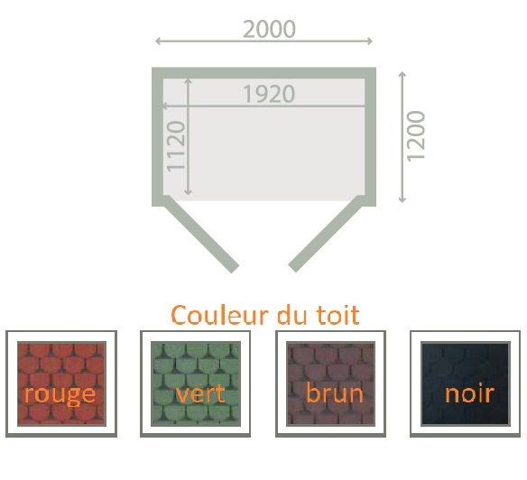 Caractéristiques : Dimension (L.xl.) avec le toit: 222,6x149,3 cm Dimension sans le toit : 200x120 cm Hauteur : 194,5 cm Poids : 170 kg Matière : bois épicéa Épaisseur du mur : 14 mm Matière du toit : bois épicéa Épaisseur du toit : 16 mm Matériau de couverture de toit : toit en feutre Matière du sol : bois épicéa Épaisseur du sol : 16 mm Couleur : naturel Humidité du bois : 18% Nb de fenêtres : 2 en verre Matière de la porte : bois épicéa Dimension de la porte : 180x90 cm x2 Épaisseur de la porte : 40 mm Fabrication européenne