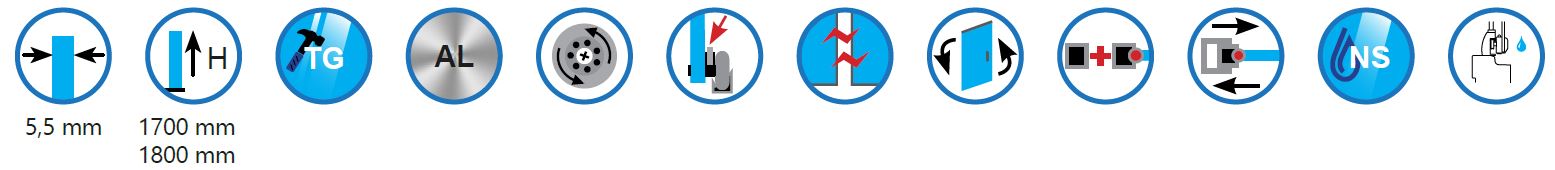 Système d’ouverture/fermeture: magnétique Finition des profilés: aluminium chromé Hauteur: 180 cm Largeur du passage: 41 cm Radius: 550