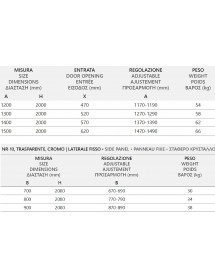 Largeur : 140 cm avec la porte coulissante Profondeur : 70 cm (panneau fixe) Hauteur : 200 cm Poids: 92 kg Verre en nanotechnologique Épaisseur du verre: 8 mm tempéré Fermeture soft-close amortie Finition des profilés: aluminium doré Installation : gauche ou droite