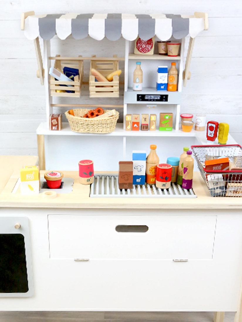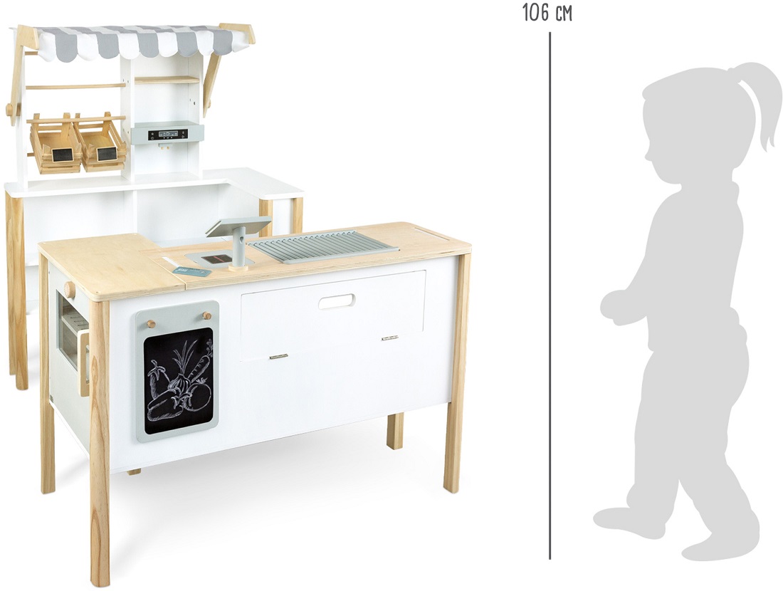 Boutique marchande, kiosque et snack-bar, stand de marché, cuisine ou café? Aucun enfant n´a besoin de se décider ici! Ce grand stand de vente moderne avec housse amovible est un multi-talent qui peut changer sa fonction en un clin d´œil. Les modules flexibles créent d´innombrables possibilités de jeu et peuvent être placés en fonction de l´espace disponible et de l´idée de jeu. L´équipement ne laisse rien à désirer: scanneur avec affichage et tapis roulant, 2 paniers de vente avec étiquettes de prix, tableau à offres, robinet, machine à café, évier/caisse, barbecue/plaque chauffante et four/frigo ! Offre beaucoup d'espace pour plusieurs enfants ! En imitant des situations quotidiennes, l'accent est mis sur l'apprentissage ludique et amusant, dans lequel l'interaction sociale s'apprend dans les rôles d'acheteur et de vendeur ou en cuisinant. Après le jeu, on regroupe les éléments pour gagner de la place. Un vrai classique du jeu de rôle dans un design nordique moderne et simple !