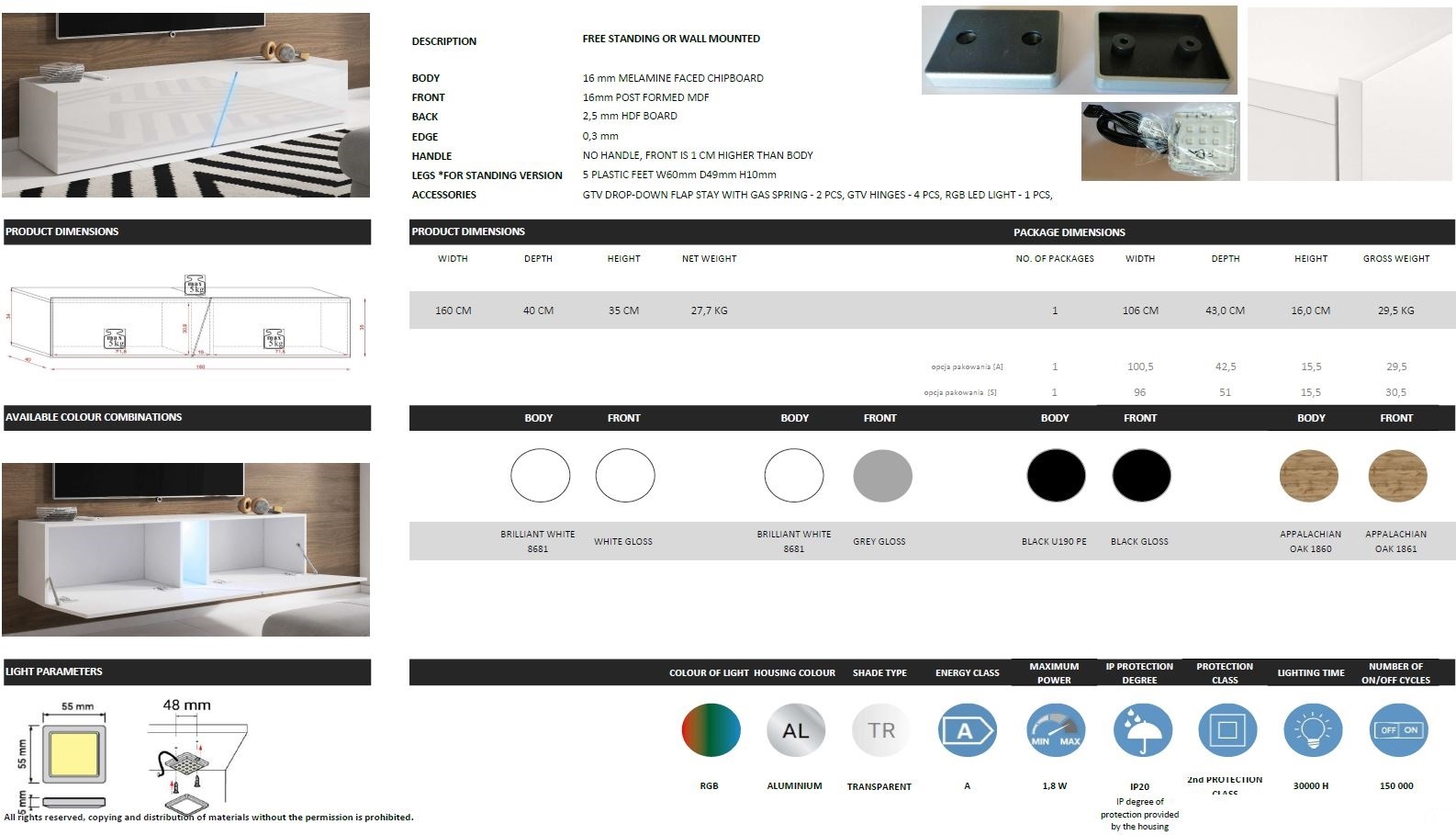 Le meuble TV SLANT est un meuble unique qui apportera un caractère exceptionnel à chaque intérieur. Ce meuble est conçu pour être suspendu, ce qui donnera un effet de légèreté, ou il peut être posé au sol après fixation des pieds. Les rainures design en diagonales rendent le produit accrocheur et le léger éclairage LED souligne le caractère unique du modèle. Les ouvertures de la façade avant se font du haut vers le bas et offrent des niches spacieuses pour entreposer vos effets et appareils électroniques. Ce produit est disponible en différents coloris et dimensions. Les matériaux agglomérés et MDF utilisés pour la production de ce meuble sont choisis pour leur qualité.